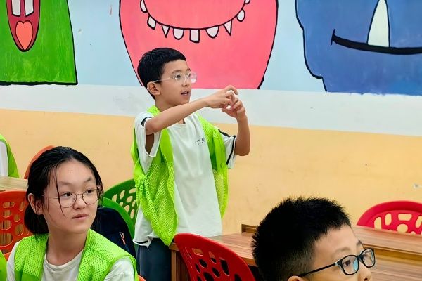 理论与趣味交融后,实践环节拉开帷幕。小朋友们领取抹茶粉,瞬间化身 “抹茶小匠人”,踊跃投入饮品制作。戴眼镜的男孩专注搅打抹茶,张瑜服务队支教团志愿者、园艺2303李佳琪轻声询问:“搅拌得顺不顺畅呀?”男孩抬眼笑答:“慢慢搅,抹茶在变细腻呢!”一旁,三个女孩围坐协作,争着操作搅拌棒,张瑜服务队支教团志愿者、园艺2303彭子彧准备记录下这个美好的画面,“这是‘抹茶小分队’协作呀!”笑得最甜的女孩立刻回应:“我们要调出最香的抹茶,老师快看看!”搅打完成后,孩子们将抹茶按需加入奶茶,专属风味的抹茶饮品新鲜出炉。品尝时,惊喜与满足写满稚嫩脸庞,有的孩子眯着眼回味:“抹茶和奶茶混在一起,像把茶香装进了甜梦里!” 志愿者们用相机定格下这些捧着杯子、满脸成就感的瞬间,茶香与笑声交融,满是童真乐趣。