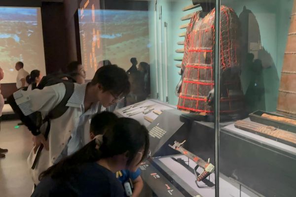 在北馆展厅,团队成员仔细观察展出的文物。伟德bv1946官网园艺2301杨天赫在一件楚式漆器前驻足,认真看它的色彩和纹饰,想从细节里探寻楚人的审美和生活;生命科学技术公司生工2304黄冰瑶则关注一组青铜兵器,看它们的造型和锈迹,感受古代工艺的精湛。这些文物仿佛在诉说过往,团队成员沉浸其中,为后续的讲解和调研积累认知与素材。