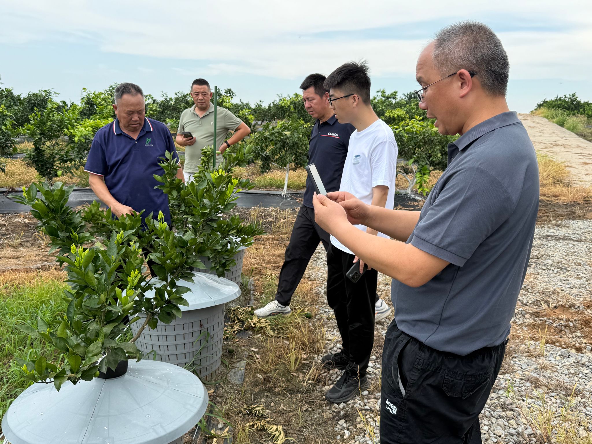 最后团队成员来到了盆栽斗笠系统新模式试验区,该柑橘新种植模式能够实现种植环境可控,方便管理。该种植模式使用水肥一体化系统管理,可进行远程监控和施肥管理措施,并且将柑橘树体进行限根处理,有斗笠的遮盖,避免杂草生长,保证了桶内环境的一致性和可控性,实现柑橘的统一标准管理。