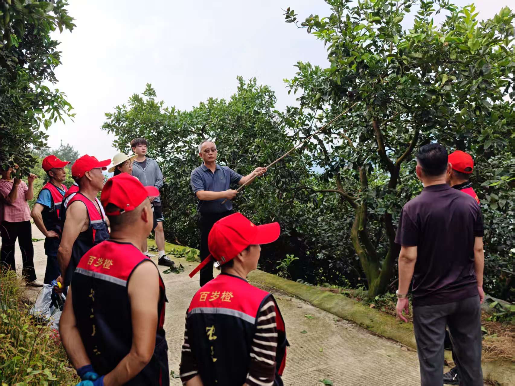 随后团队成员来到了美人沱村的柑橘种植区域,针对当地柑橘的树型,刘永忠教授首先召集了当地的工人们对其进行树型改造的讲解,核心要求就是缩冠,树冠高度要达到伸手可及的范围,才能实现真正意义上的轻简化。董治浩副研究员进行了实地操作,为当地工人演示如何正确修剪好一棵柑橘树。