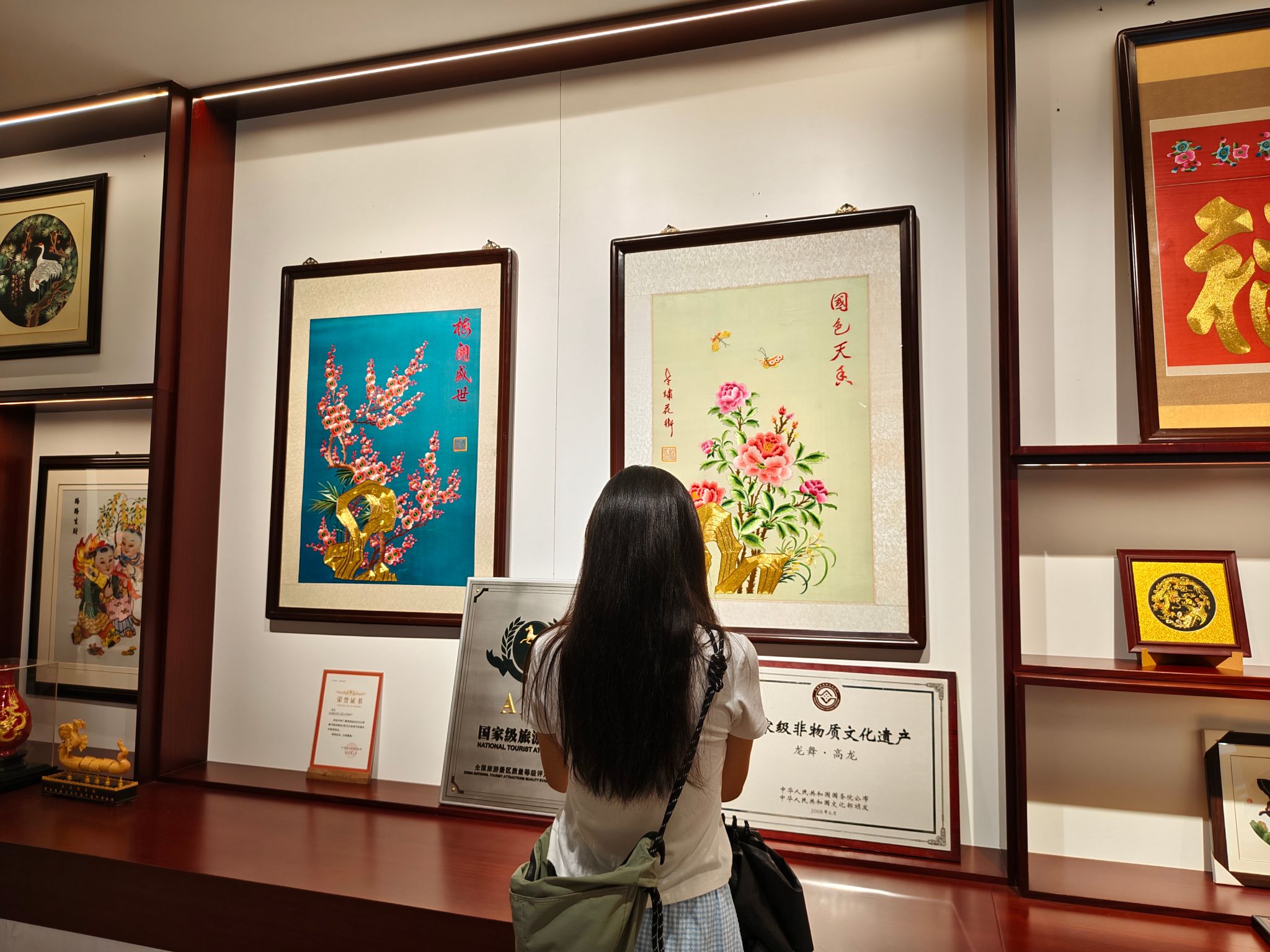 迈进博物馆展厅,“汉绣历史沿革” 主题展板率先揭开岁月序幕。汉绣始于汉代,兴于唐代,盛于清代,在武汉地区逐步形成鲜明地域特色:从三国时期刘备借荆州时的手工制绣雏形,到清代嘉庆年间武汉绣坊林立的繁盛景象;从 1910 年汉绣作品获南洋赛会奖项扬名全国,到 2008 年正式入选国家级非物质文化遗产名录…… 千年传承的时间轴清晰呈现,让团队成员直观触摸到汉绣厚重的历史温度。