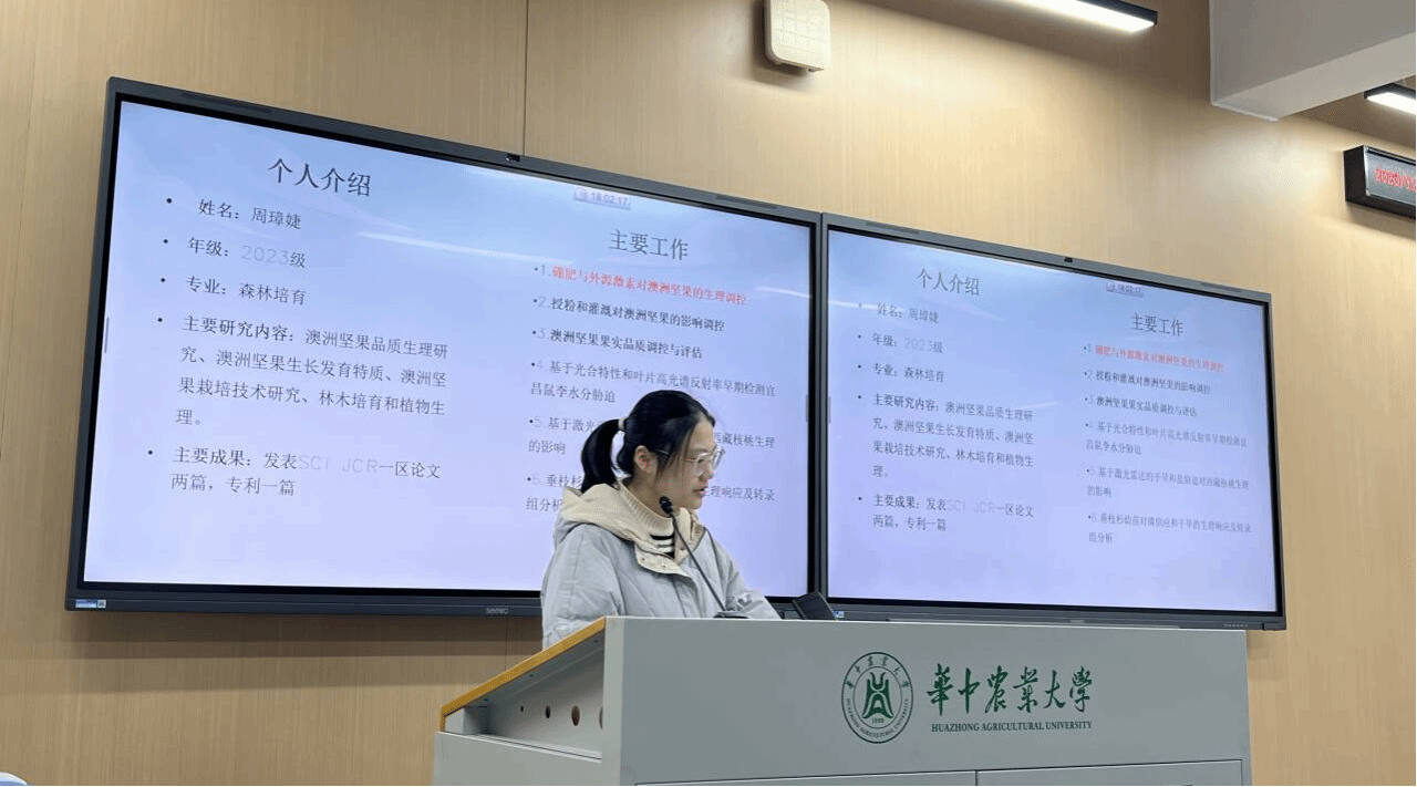 活动第一部分以国家奖学金获得者的经验分享为主要内容。2023级森林培育硕士生周璋婕结合自身在科研探索中的心路历程,系统地复盘了自己申请国家奖学金的成功经验。她从课题选题、实验开展、论文撰写及评审准备等方面讲述了关键要点,给同学们传授了很多“小妙招”。周璋婕同学指出,在遇到难题时,要积极与导师讨论、善于利用好的科研工具。此外,在研究生学习生涯中要把科研工作放在第一位,但是也要保持良好的心态,不要过分焦虑。