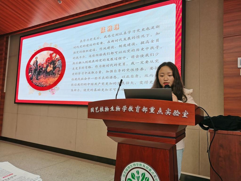 活动伊始,由园林第一党支部的彭密密主讲此次党史学习心得分享。她从以下四个方面进行讲解:党史基本知识介绍、党史内容节选、党员同学党史学习心得以及学习党史的意义。在第三部分的演讲中,彭密密选取了园林支部七名党员同学的学习心得,与在场的同学们分享了党员同志们的学习经验,加深了他们对党的历史的了解。彭密密提到,历史是一面镜子,它照亮现实,也照亮未来。我们要重视对历史的学习和对历史经验的总结与运用,善于从不断认识和把握历史规律中找到前进的正确道路。