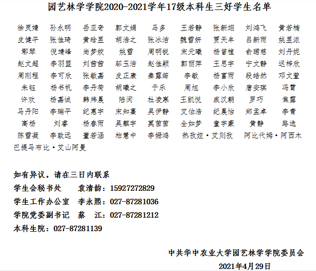 伟德bv1946官网2020-2021学年17级本科生三好员工名单公示