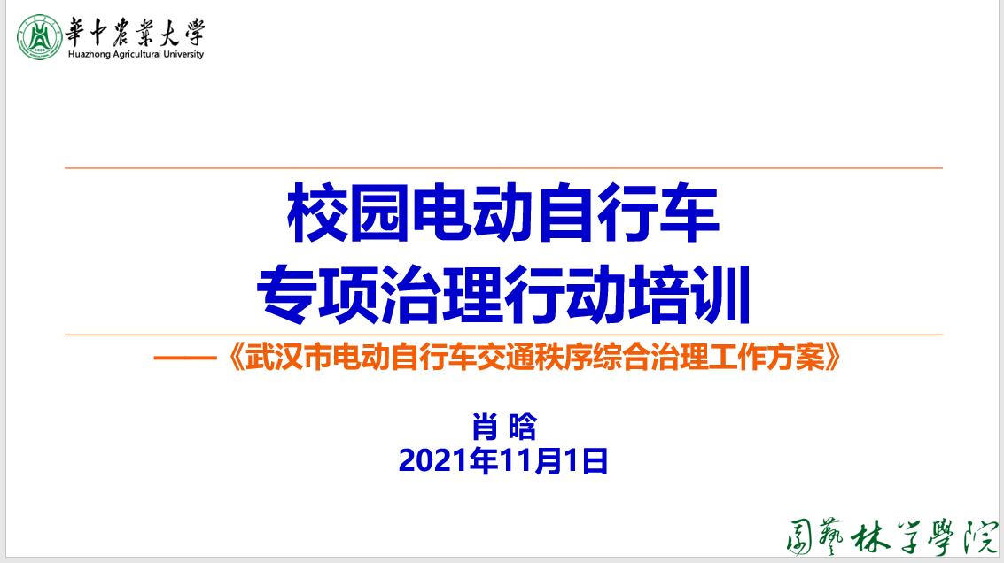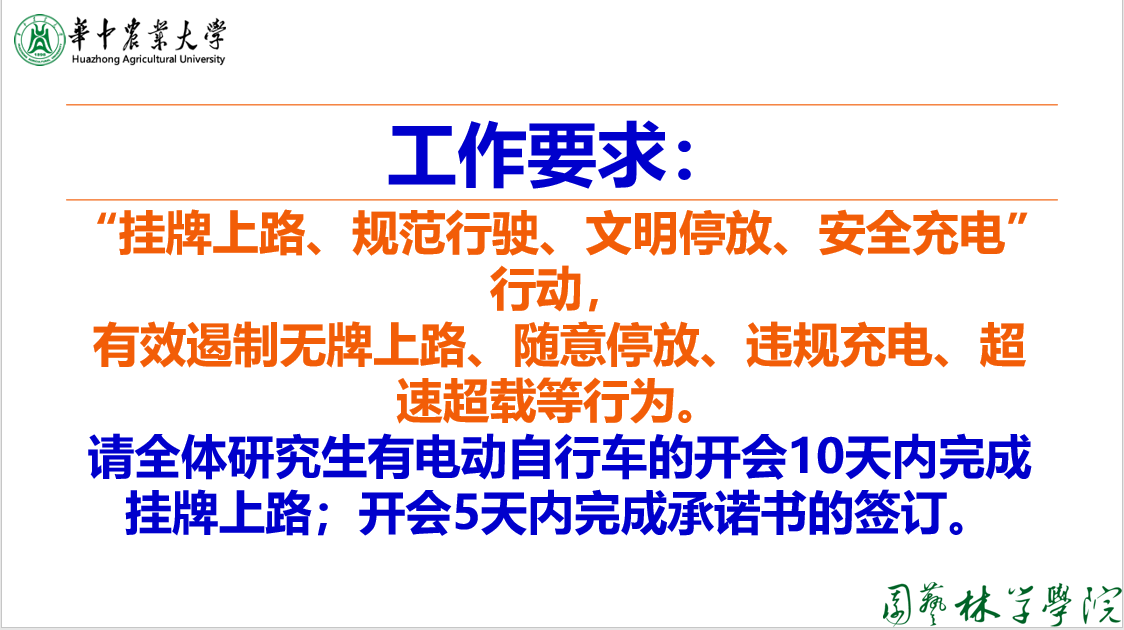 会议伊始,肖晗带领参会人员就“校园电动自行车专项治理行动”展开学习,学习内容包括武汉市公安局交通管理局“致广大师生的一封信”和bv伟德国际1946“文明交通承诺书”、“电动自行车安全使用八不准”。会议强调,校内师生应安全乘驶,规范乘驶,不酒驾酒乘、不超速不并行、不占道不载人、不闯信号灯;应文明停车,规范停车,不占安全通道、不停线外区域;应安全用电,规范充电,不室内充电、不私接飞线。会议中肖晗建议大家,未上牌车辆尽量在10月15号之前上牌,10月20号后交警将在校内执法,违规者交警将会依法罚款或扣留车辆。同时,就室内充电问题肖晗也列举了室内充电瓶起火案例,他强调室内充电安全隐患巨大,不能冒险违规充电。学习结束后,肖晗对校内师生电动自行车使用提出要求并部署以下工作,首先要求电动自行车车要“挂牌上路、规范行驶、文明停放、安全充电”,其次要求全体研究生有电动自行车的会后10天内完成挂牌上路,会后5天内完成承诺书的签订。