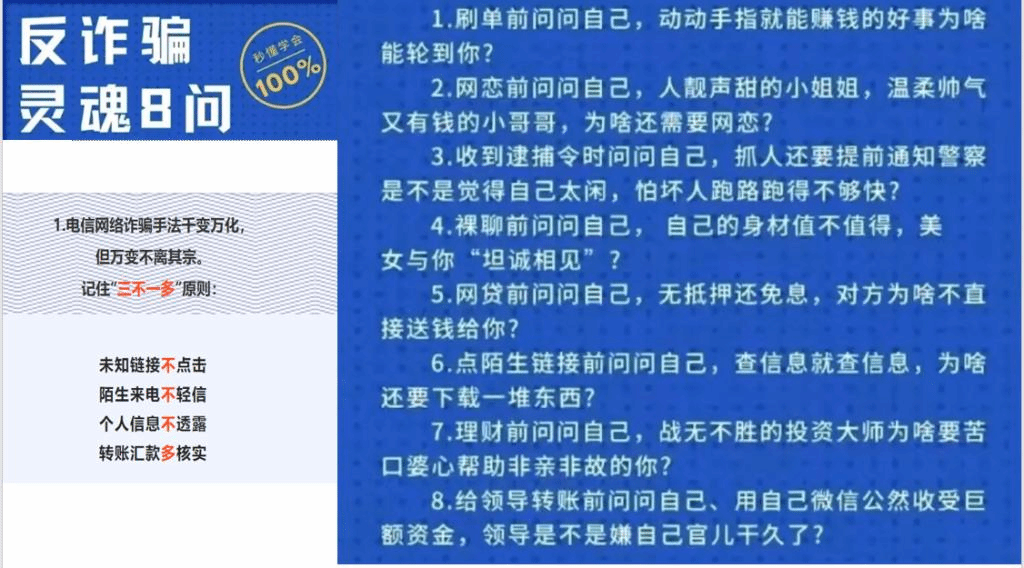 在电动车文明行驶专题会议结束后,肖晗对参会研究生进行了防诈骗培训。首先,肖晗提醒研究生下载“国家反诈中心”APP,未下载的同学应及时下载。之后,肖晗对刷单、网恋、被下逮捕令、裸聊、网贷、陌生链接、理财帮投、熟人(如领导)诈骗常见8类网络电信诈骗手段提出灵魂“8问”,他建议同学们,面对陌生来电来信,要多问自己,多思考,多细想,抓住逻辑的漏洞,不要给骗子可乘之机;面对电信网络诈骗手法多变,要坚持“三不一多”原则,即未知链接不点、陌生来电不信、个人信息不露、转账汇款多检。