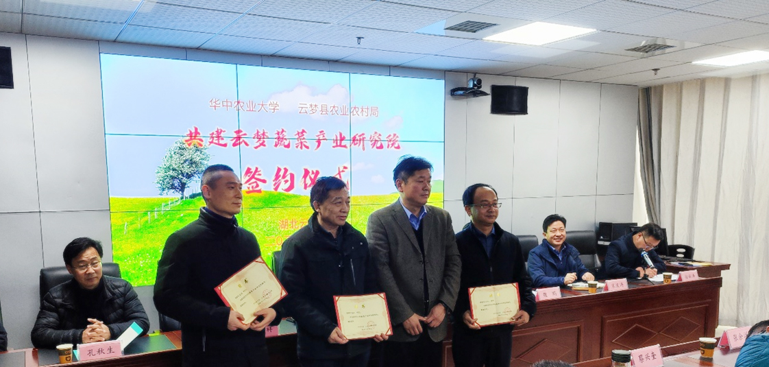 会上,公司与云梦县农业农村局签订了共建“云梦蔬菜产业研究院”协议。省农业农村厅领导、云梦县领导共同为“云梦蔬菜产业研究院”授牌。聘任云梦县农业农村局副局长倪三毛和bv伟德国际1946宋波涛教授为首届研究院经理。聘任湖北省蔬菜办公室主任袁尚勇、湖北省农技推广总站研究员羿国香和公司伟德bv1946官网汪李平教授为产业顾问。
