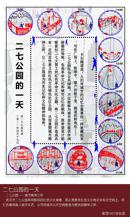 “这是一个怎样的世界?“景园1802班的孙长虹在调研之后产生了这样的思考。在他的作品《二七公园的一天》中,红色与蓝色交织,通过一天不同的时间点串联起二七公园不同的活动空间以及人在空间中不同的行为心理。孙长虹谈道:”二七公园具有十分厚重的革命历史底蕴,它与京汉铁路大罢工这一历史事件密切相关,所以我希望能够通过对二七公园的更新改造设计重新塑造城市居民的精神之所,让人们在公园中可以充分感受到革命的奋斗精神,铭记历史和革命先烈的无私奉献。“景园1801班的吴兆天通过对二七公园走访调查,在全天实地观察人群游憩活动行为后,从各时段人群游憩行为中选取了六种比较典型的行为进行了记录与感知描绘。作品《重返“二七”》是景园1802班孟辰玥的作品,她用细腻的笔触描绘了人们在二七公园的行为活动。