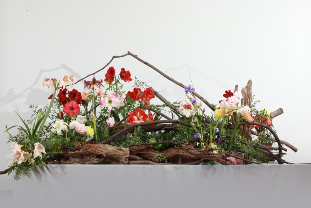 本次活动还陈列有十余组大师花艺作品,线上线下均可欣赏。bv伟德国际1946副教授秦仁强创作的大型花艺作品《湖山胜意》为当日点题之作。长3米,宽2米的造型中,树枝横斜,蜿蜒虬曲,如山峦跌宕,朱顶红热烈胜火,鸢尾袅娜挺立,似山花烂漫,还有红润樱桃果、青黄小麦苗等立夏新品点缀其间,以风情万种的湖光山色盛赞夏之蓬勃,祝颂万事皆胜意。