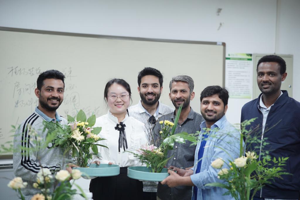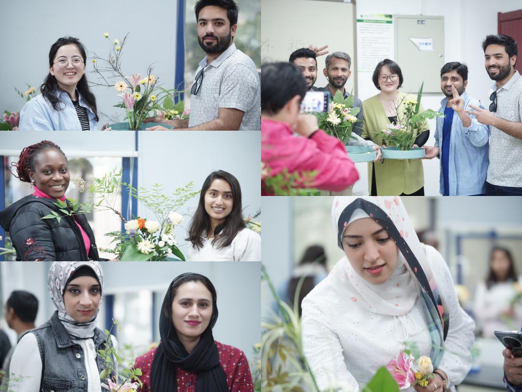 以花悟道,修身养性。职工们格外珍视此次插花活动,女生们精心打扮,男生们特意着装,大家精心设计每一个插花步骤,认真完成属于自己的插花作品,直到活动结束前一秒才满意地将自己的作品呈现在展示台上。来自巴基斯坦的任一凡同学表示:“自己非常喜爱花,这次的花艺体验让他感受到了中国传统花艺的博大精深,也提升了对美的鉴赏能力”。来自越南的阮范雄同学谈到:“结合以前我的了解和今天的活动,我感受到了‘真、善、美’在中华传统文化和中华精神文明中的力量”。来自缅甸的涂叶密同学开心说道:“谢谢王老师肯定我的作品,我从东方传统插花中发现了生活的乐趣”。来自埃及的李灵同学讲到:“我将花材放置在水中构型的灵感来自于自己的国花——睡莲,我希望置于水中的花朵,能够模拟睡莲漂浮在水上的圣洁美好,增加自己花艺作品的层次性和丰富性”。最后职工们争相拿着作品合影留念,留下这次东方传统插花之旅的美好回忆。