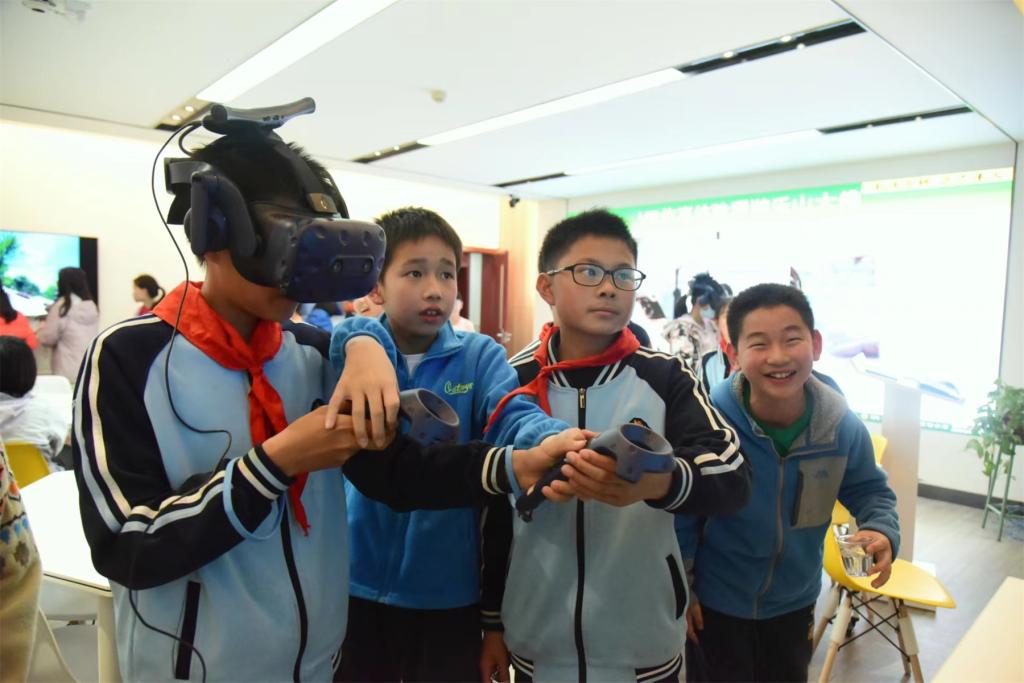 然后,徐老师让同学们化身成导游讲解员,讲述了海通和尚和石匠们建凿大佛保护航行船只的故事,让大家在同学的娓娓道来的精彩讲解中了解乐山大佛的背后的人文历史知识。最后每个同学都戴上了VR头盔和手柄,沉浸式畅游了乐山大佛景区里的各个景点。活动中同学们积极与老师们互动,大胆回答问题,积极发表自己的见解,呈现出对科技前沿探索的兴趣,让我们看到了科技的种子已然在同学们心中播下。