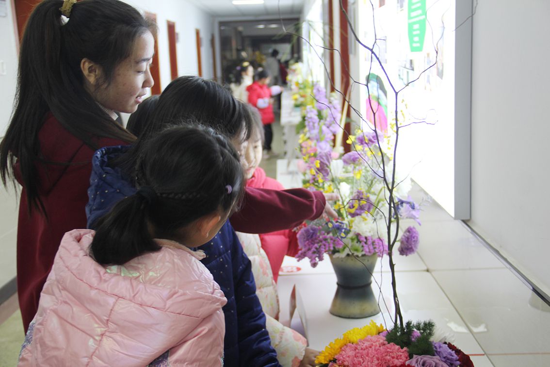 楼道里插花艺术作品分为指定主题“诗意颂中华”以及指定类型展,共50件作品整齐排列在公司二楼大厅及楼道里。小朋友们看到花卉及园林植物种类多,颜色搭配好看,与身边的同学逐一探讨插花作品,不时拍个照片,觉得每个作品名称富有诗意文化气息。尤其与花卉搭配的小动物们与作品形成完美结合,小朋友们流连忘返,不时发出惊叹。