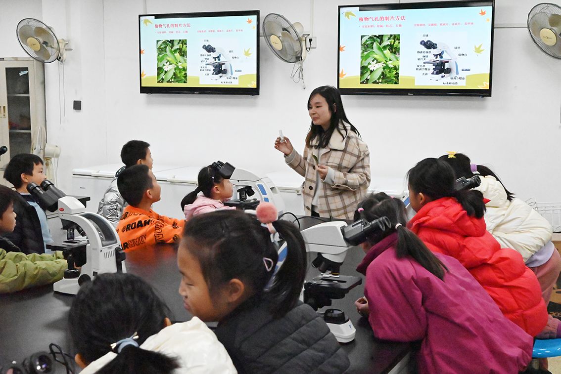 理论环节结束后,员工们迎来了期待已久的实验操作环节。方燕妮老师首先展示了制片技巧,并耐心指导员工如何正确使用显微镜。孩子们兴奋不已,纷纷拿起实验工具,迫不及待地开始了自己的探索之旅。在老师们一对一的指导下,每位员工都成功完成了柑橘叶片下表皮制片和气孔观测的实验,课堂上充满了欢声笑语。