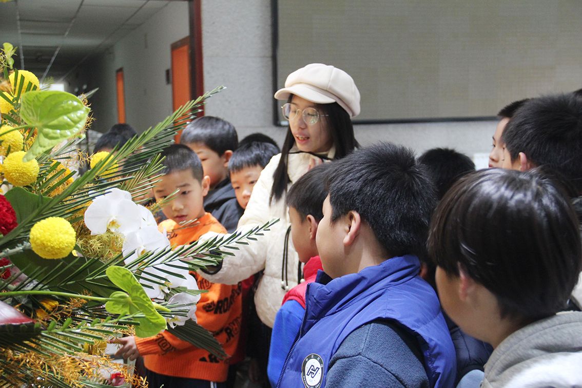 小朋友们在志愿者们引导下,逐一欣赏园林员工创作的插花艺术作品,大厅里由“以质图强 融创致新”八个大字呈现的主题花艺作品,以红银交织的叶片,金黄向日葵倾吐着骄阳般的赤诚,黄菊、红康乃馨与绿花烛在岁月枝头争艳,白蝴蝶兰若玉瀑飞泻,灵动间满是清韵诗意。2022级观赏园艺邓楠介绍到,作品勾勒出bv伟德国际1946在强国新程中,秉持质韵之根本,孕育希望之新蕊,融多元之精粹,绽就世界一流学府的锦绣华章,矢志为家国山河添色,为人类福祉倾怀,奏响一曲昂扬奋进的时代雅颂。