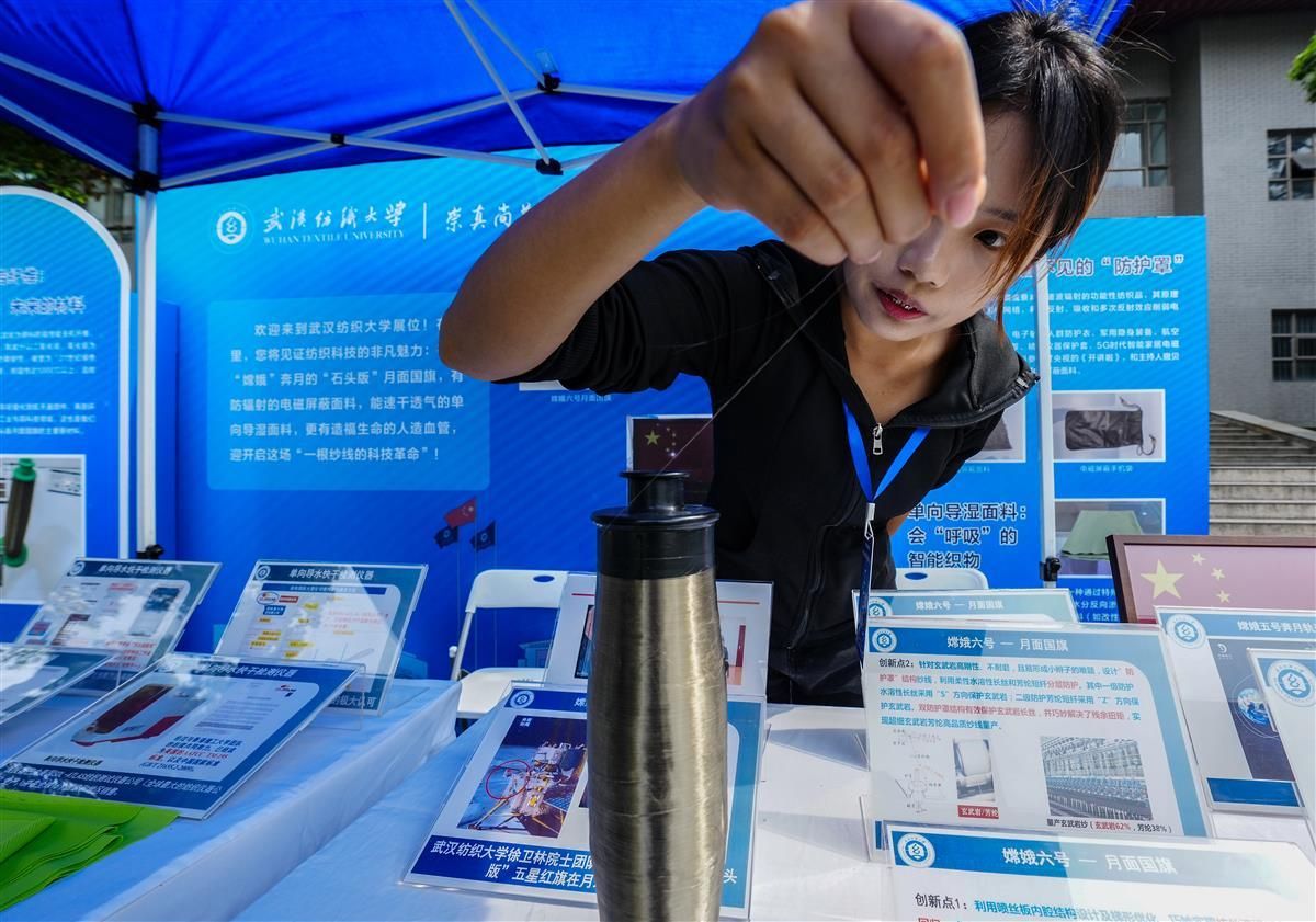 跟随“嫦娥奔月”的月面国旗,你可知它的原料来自玄武岩。在武汉纺织大学展台前,有一卷玄武岩纤维供大家围观、触摸。
