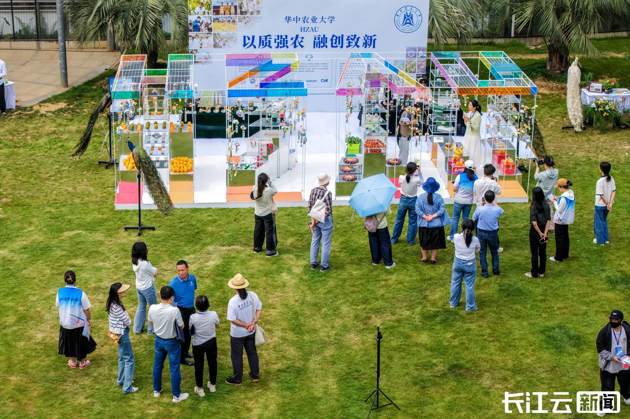 在武汉植物园花径广场,20个展位围绕“衣、食、住、行、人”开展线下亮宝,五大主题构筑起未来生活的立体模型。