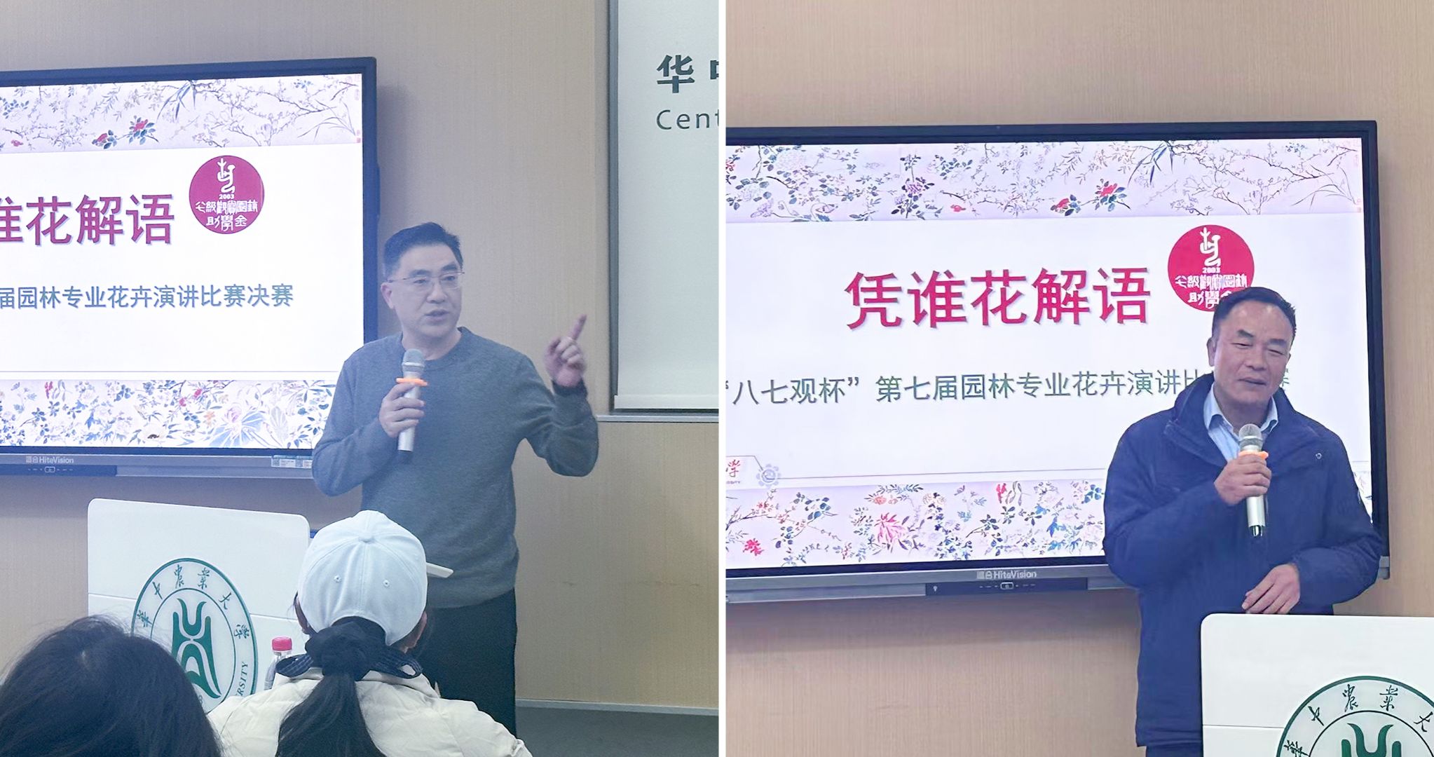 2025年12月15日晚7时,由园林专业《花卉学》课程组主办的八七观杯“凭谁花解语”第十一届花卉学课程演讲竞赛,在教工活动中心210多功能教室隆重举行。活动由胡惠蓉、张俊卫、王媛媛、张蔚、张佳琪和尚均忠老师联合筹备。武商集团副总经理、“八七级观赏园艺助学基金会”会长吴全斌先生,以及湖北清江水电开发有限责任公司所属物业公司副总园艺师张振义先生,两位华农学长作为冠名赞助方代表莅临现场,与师生共赴这场“以花为媒”的学术与文化之约。